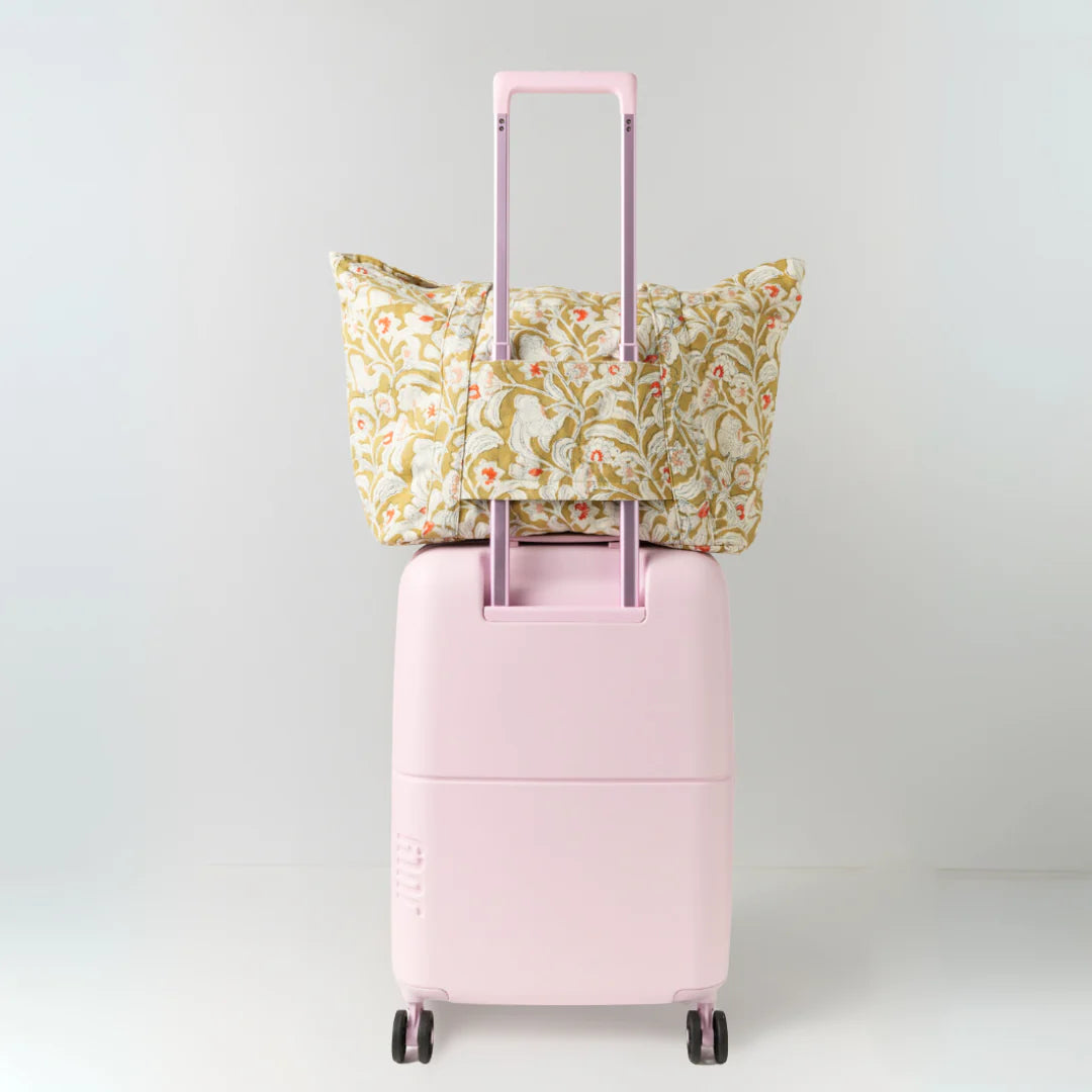 With our signature hand-block printed patterns, the Billie Bag seamlessly combines style and practicality. Luxurious gold hardware adds an elegant touch, and the built-in luggage band allows for easy attachment to your suitcase, making it ideal for hassle-free travel.