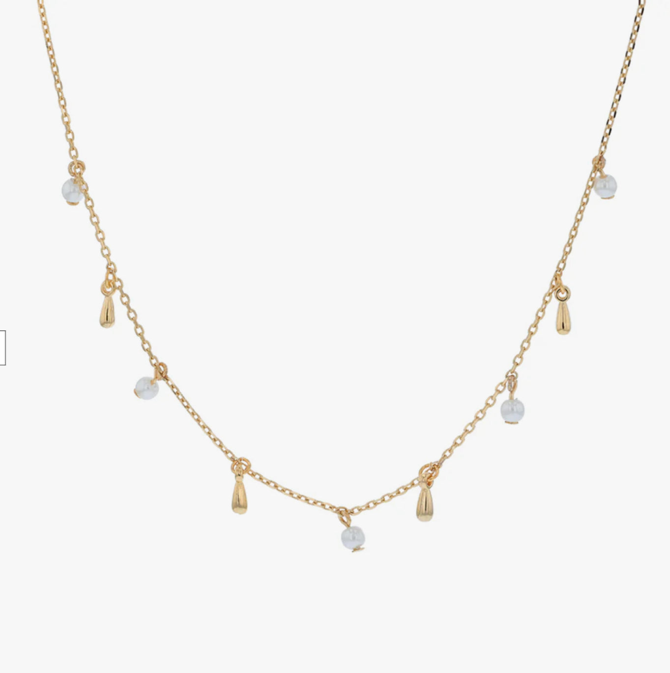 The Cassandra Necklace is a delicate style with small hanging fresh water pearls and teardrop charms.