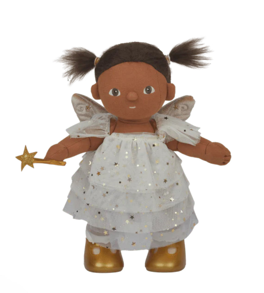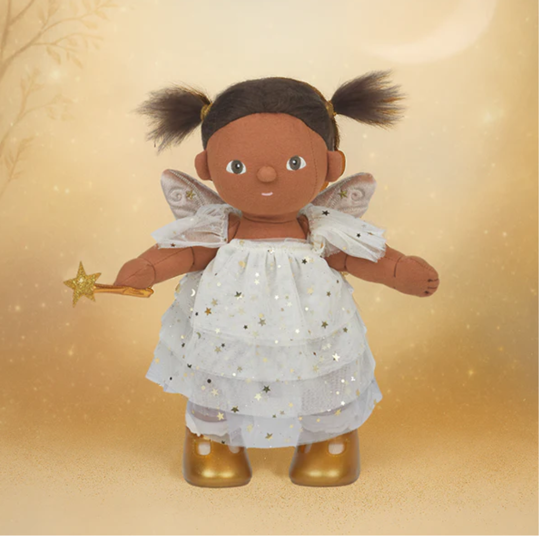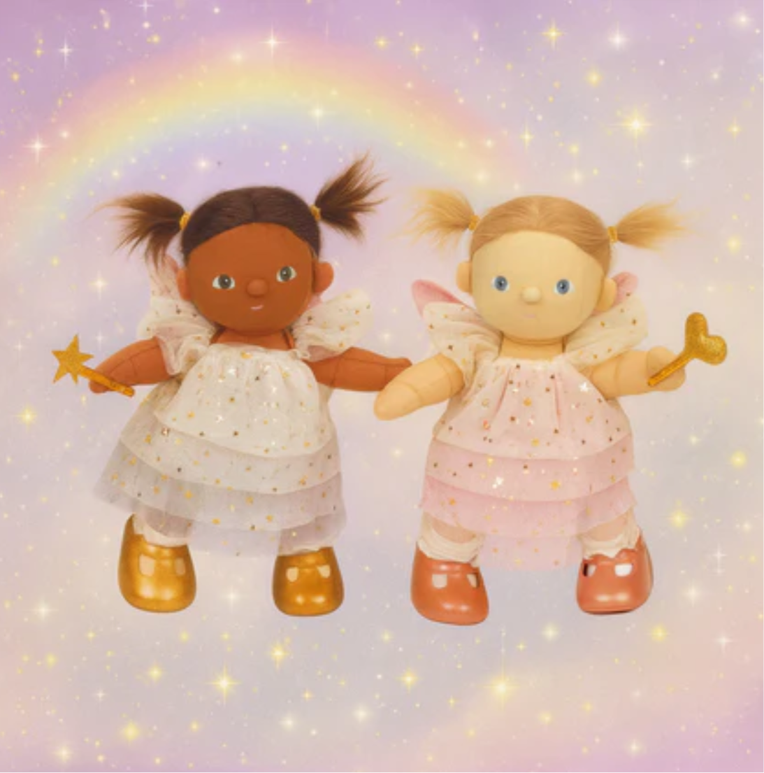 With magnets hidden in her hands, Freya can hold her star wand, fairy snacks, or even a tiny unicorn - ready for any adventure. Her plush wings shimmer with every spin, and her glittery shoes are made for stardust-stomping and fairy footwork. She’s dressed to enchant in a tulle dress and frilly socks, and her soft cotton body is perfect for big squeezes and sweet dreams.