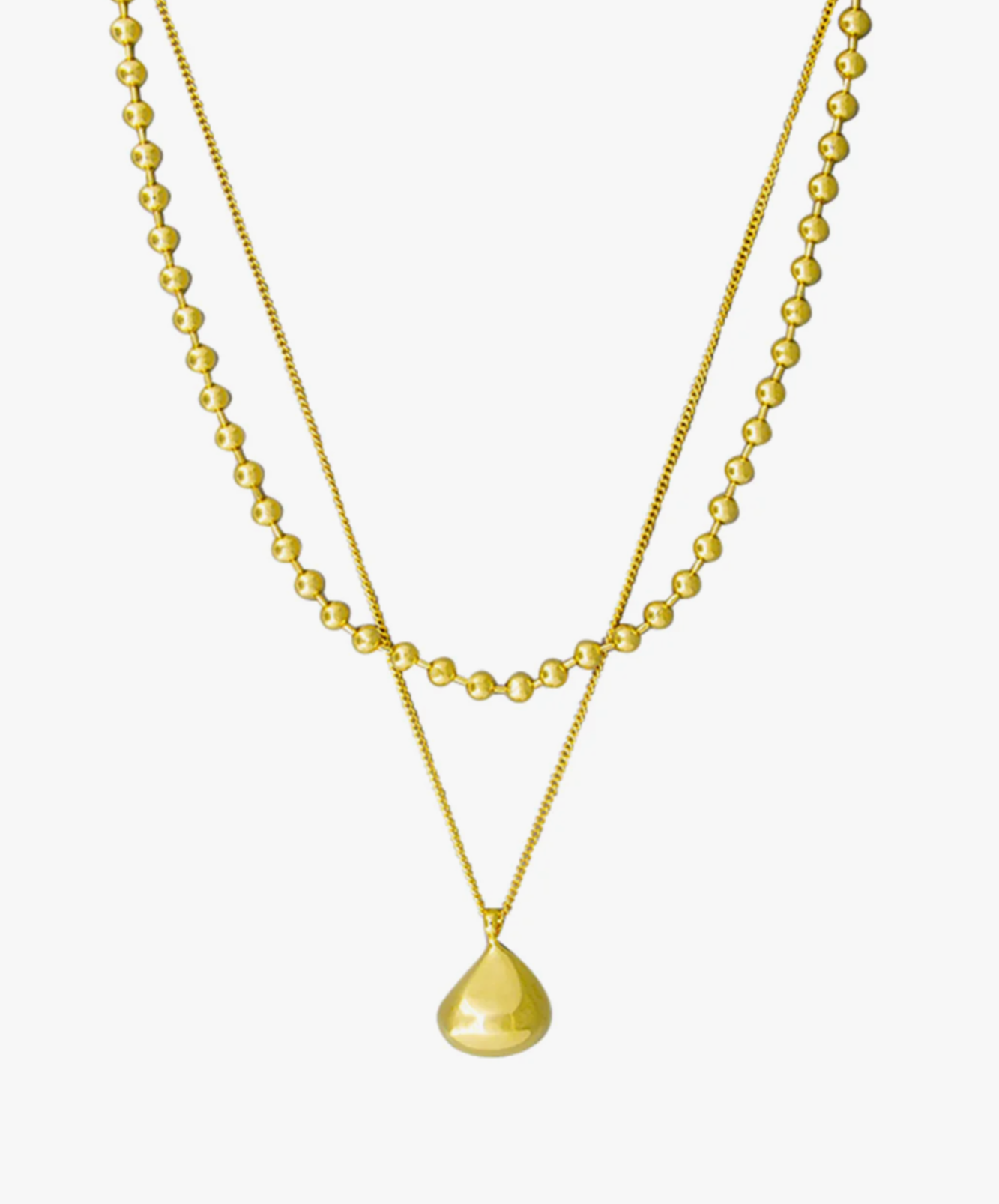 The Gail Necklace features two layers stacked together for a dramatic look. With a large, pear-shaped pendant hanging off this piece's end and a symmetrical bauble chain. This necklace will be the perfect addition to your jewellery collection if you're seeking something bold and stunning.