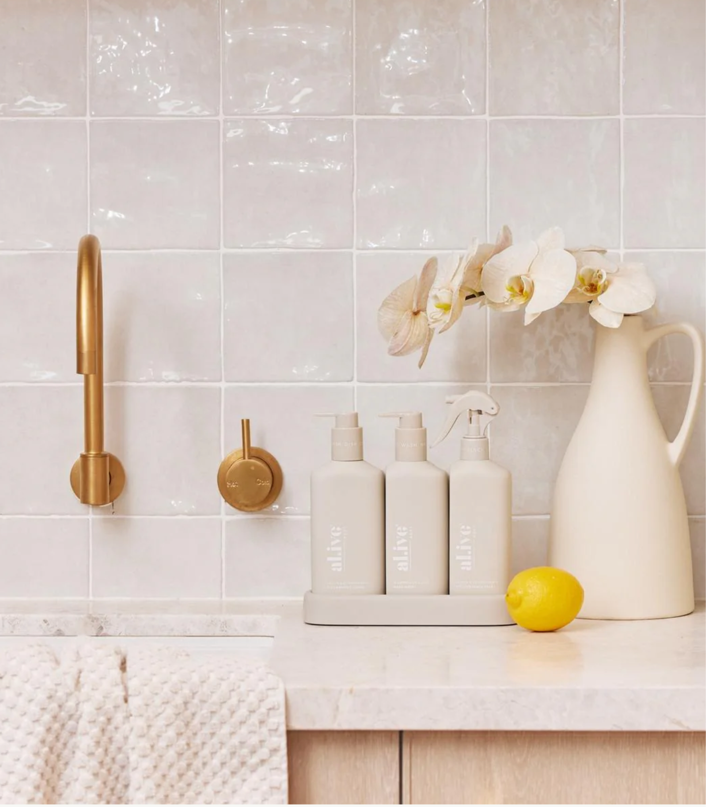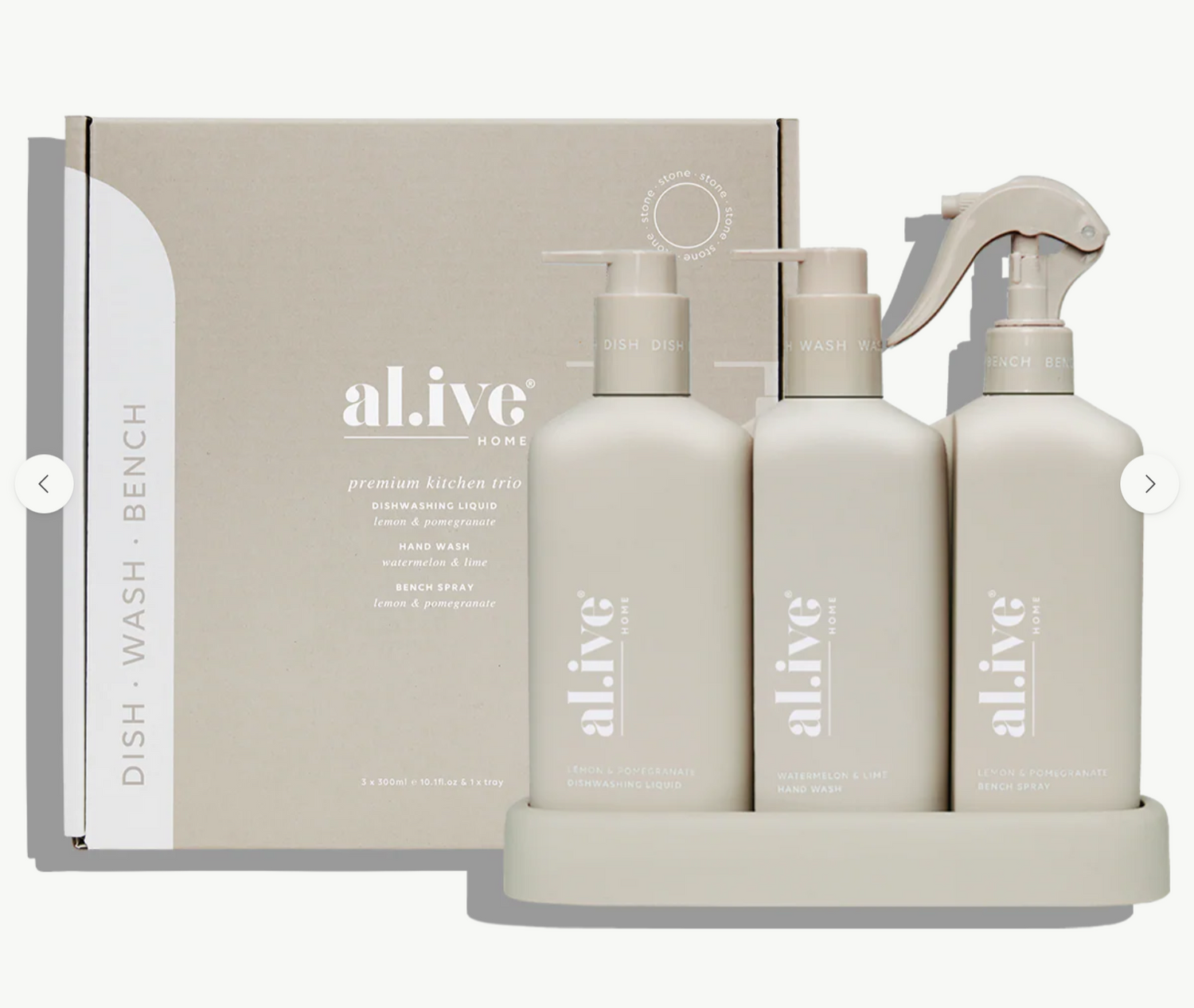 Introducing our Kitchen Trio - the ultimate solution for your kitchen cleaning needs. This set includes our Dishwashing Liquid, Bench Spray, and Hand Wash, all conveniently nestled within a beautifully designed custom tray.